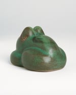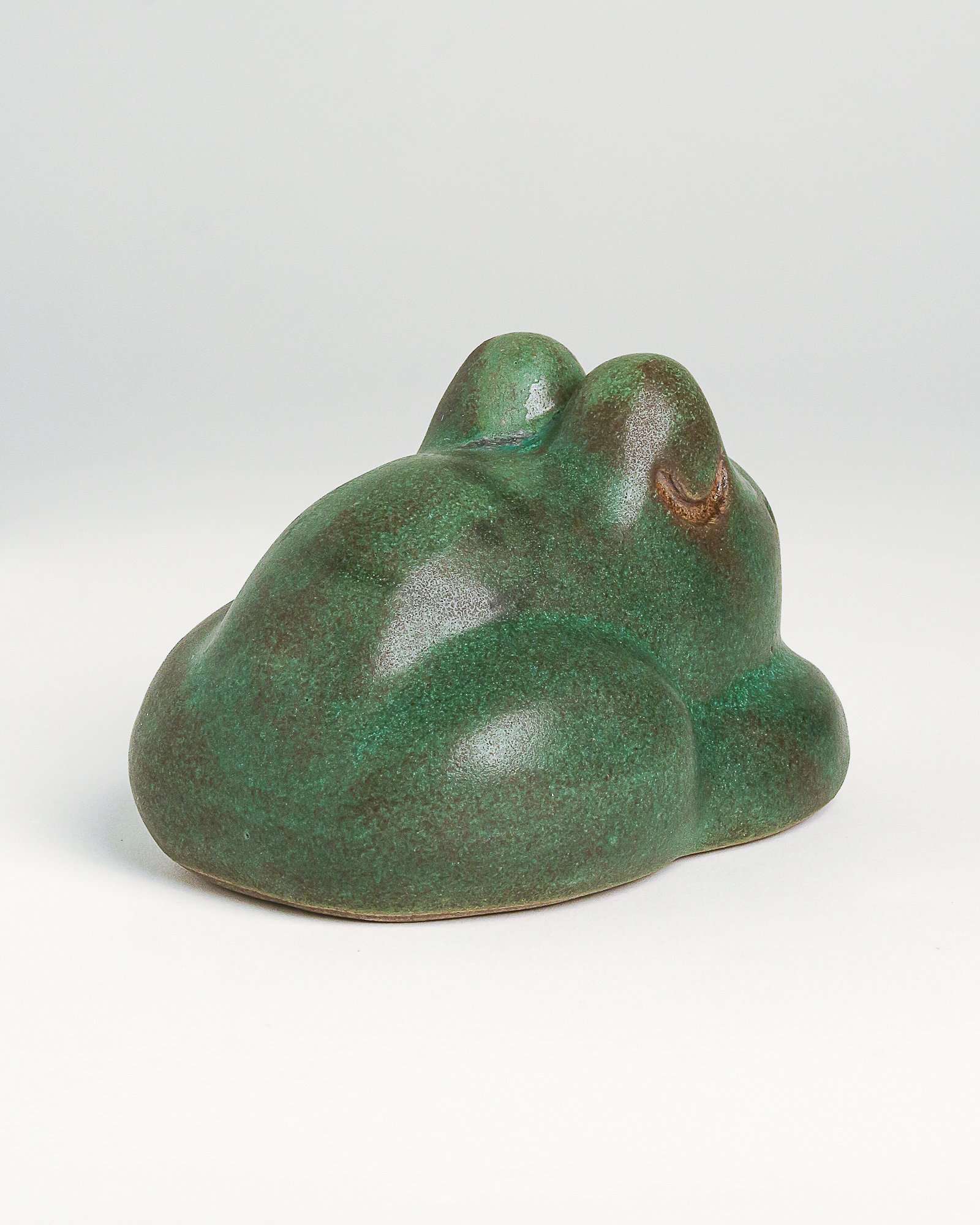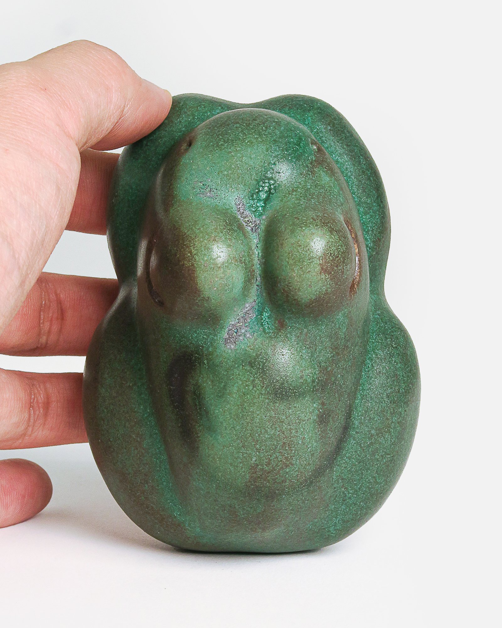 Satin emerald green glaze with brown speckle variations and more opaque green areas