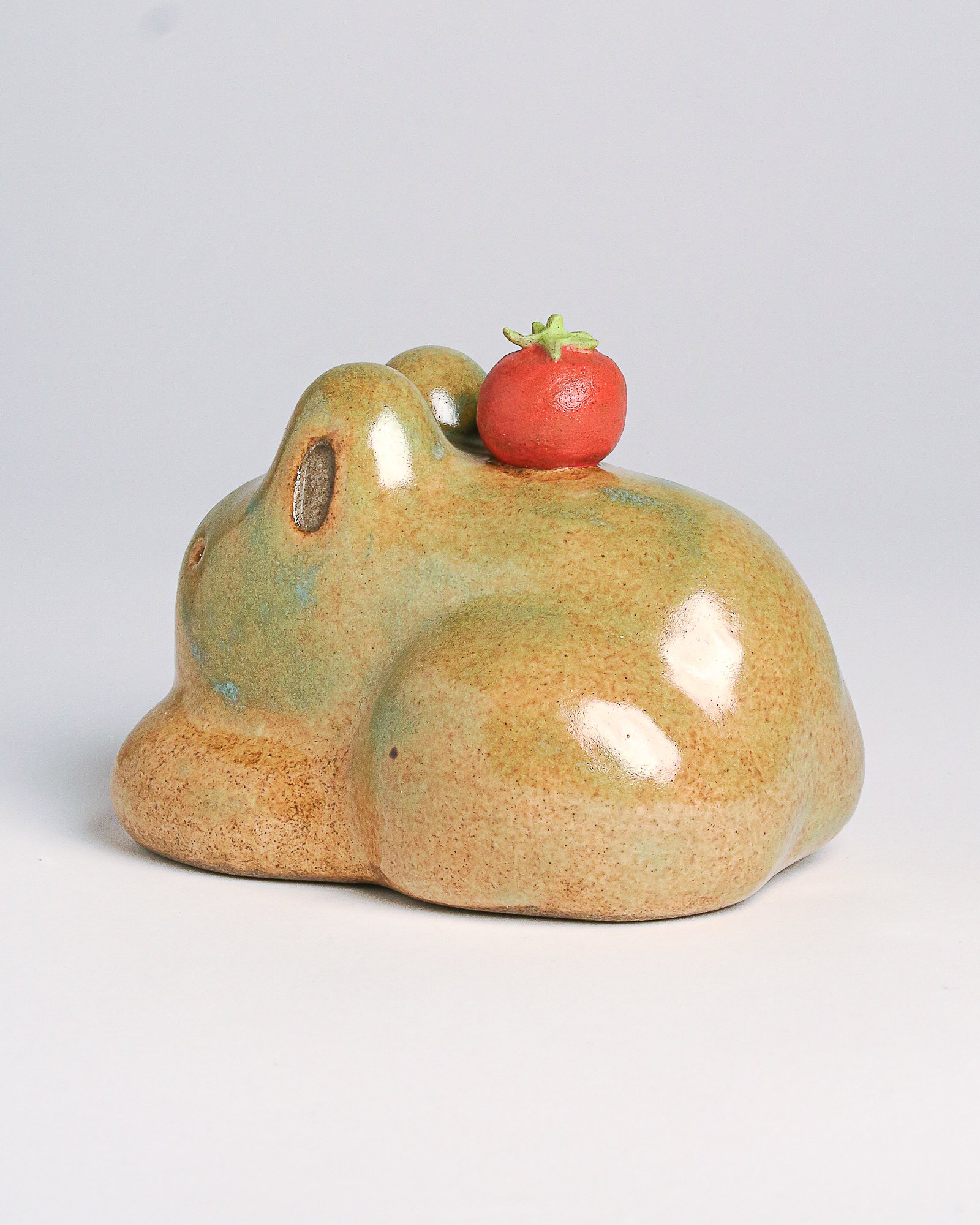 Glossy straw yellow with pale green variations on frog with red tomato on top