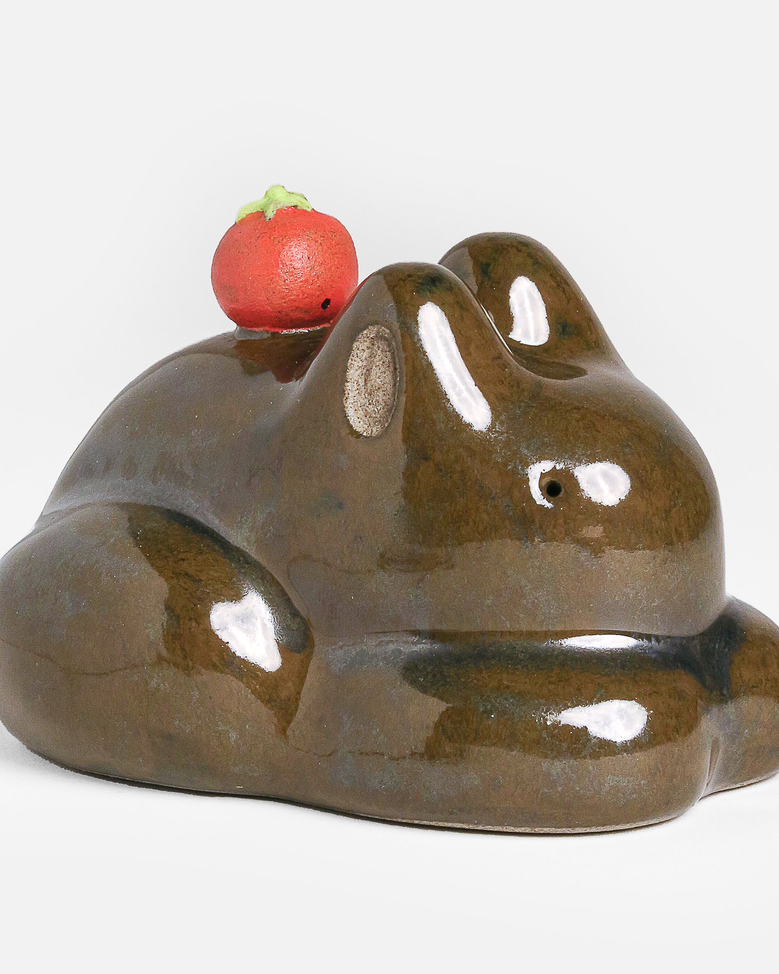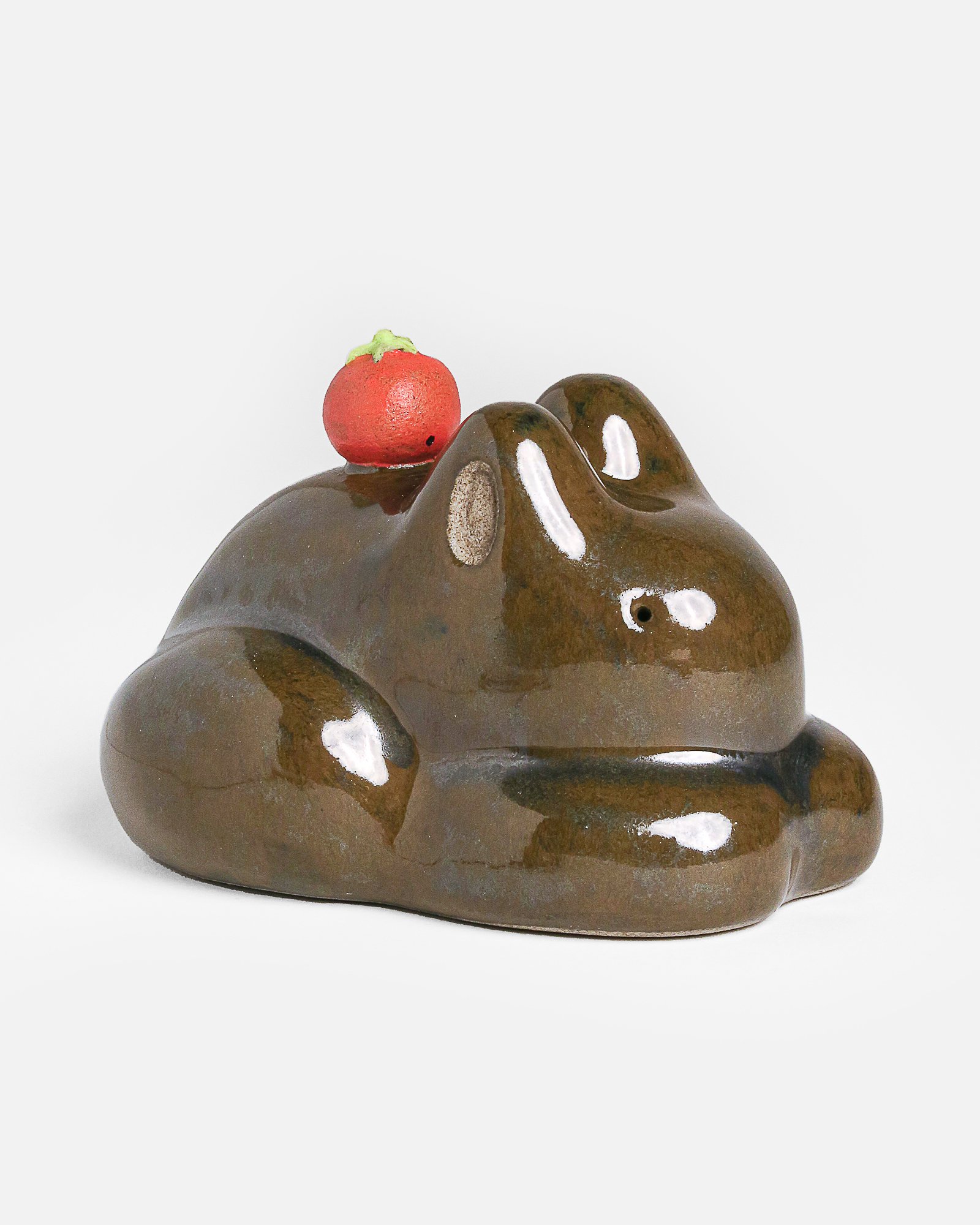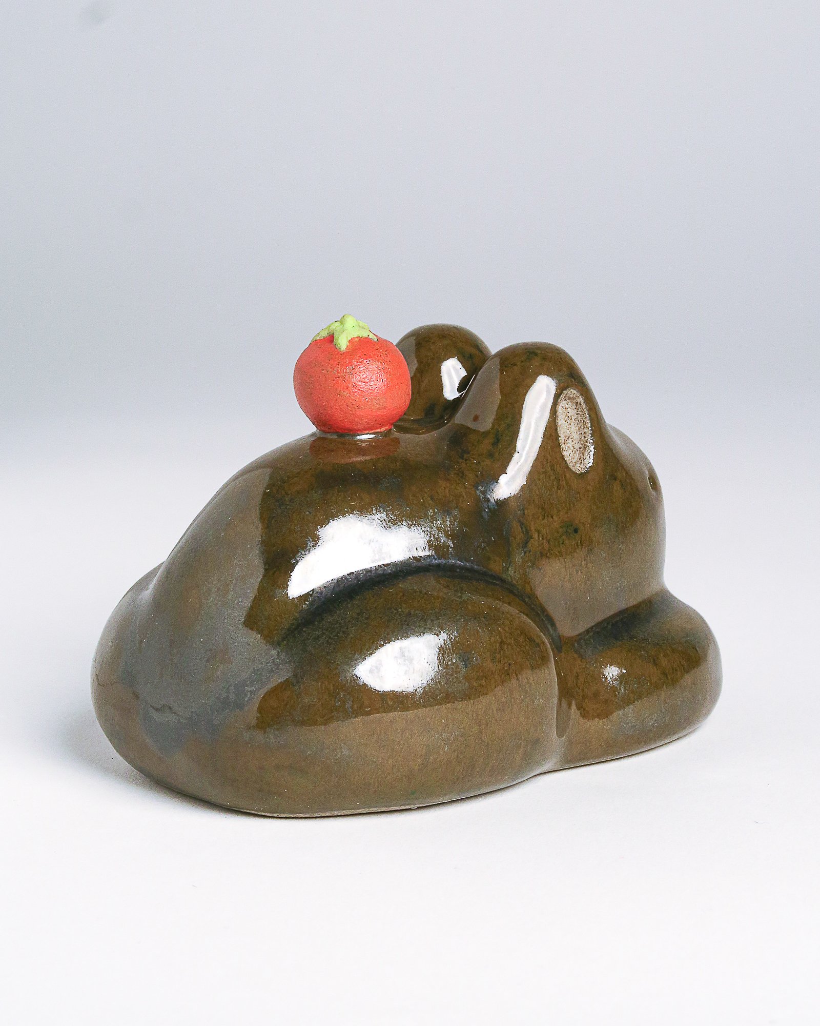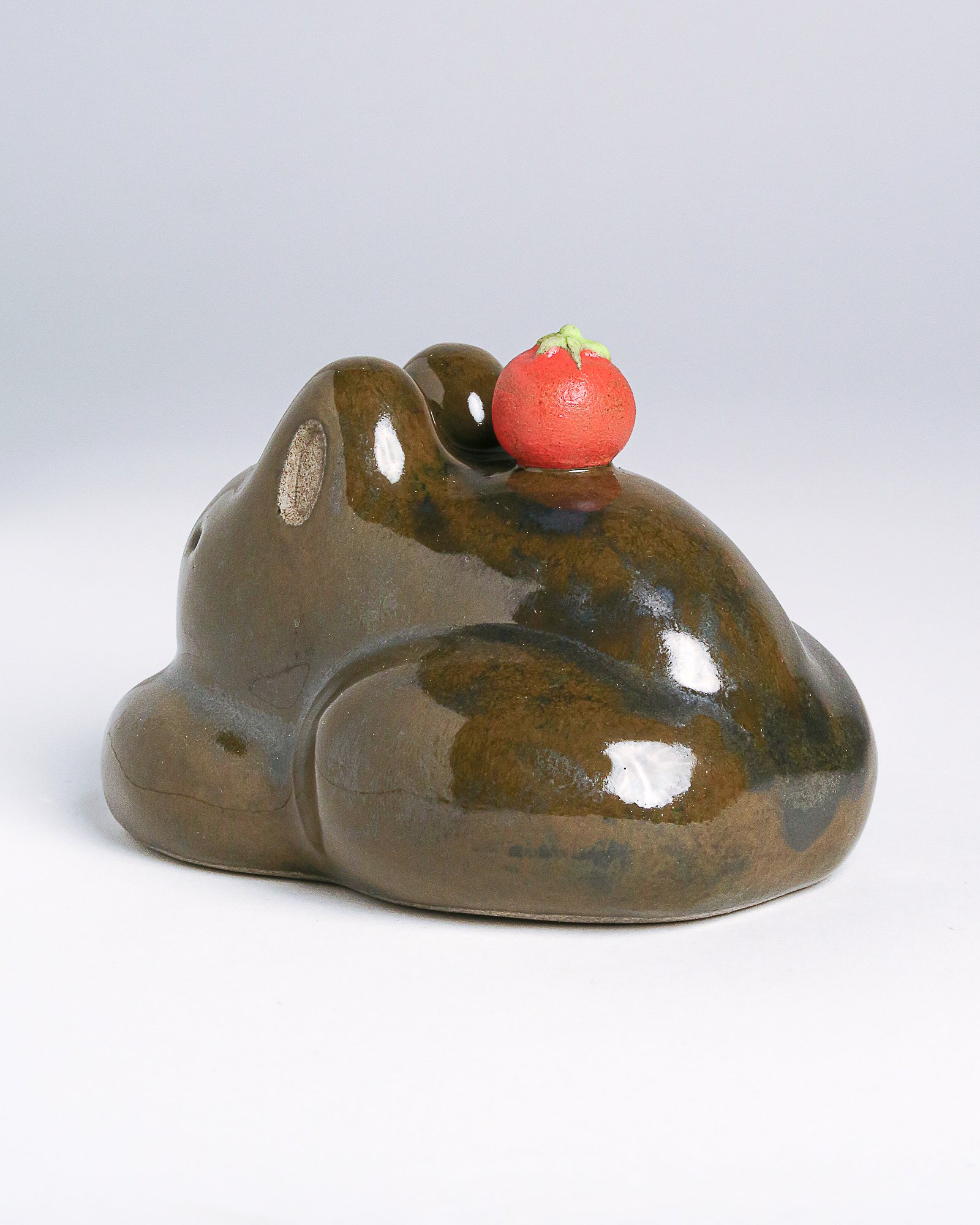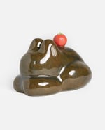 Glossy olive green glaze all over frog with red tomato on top