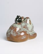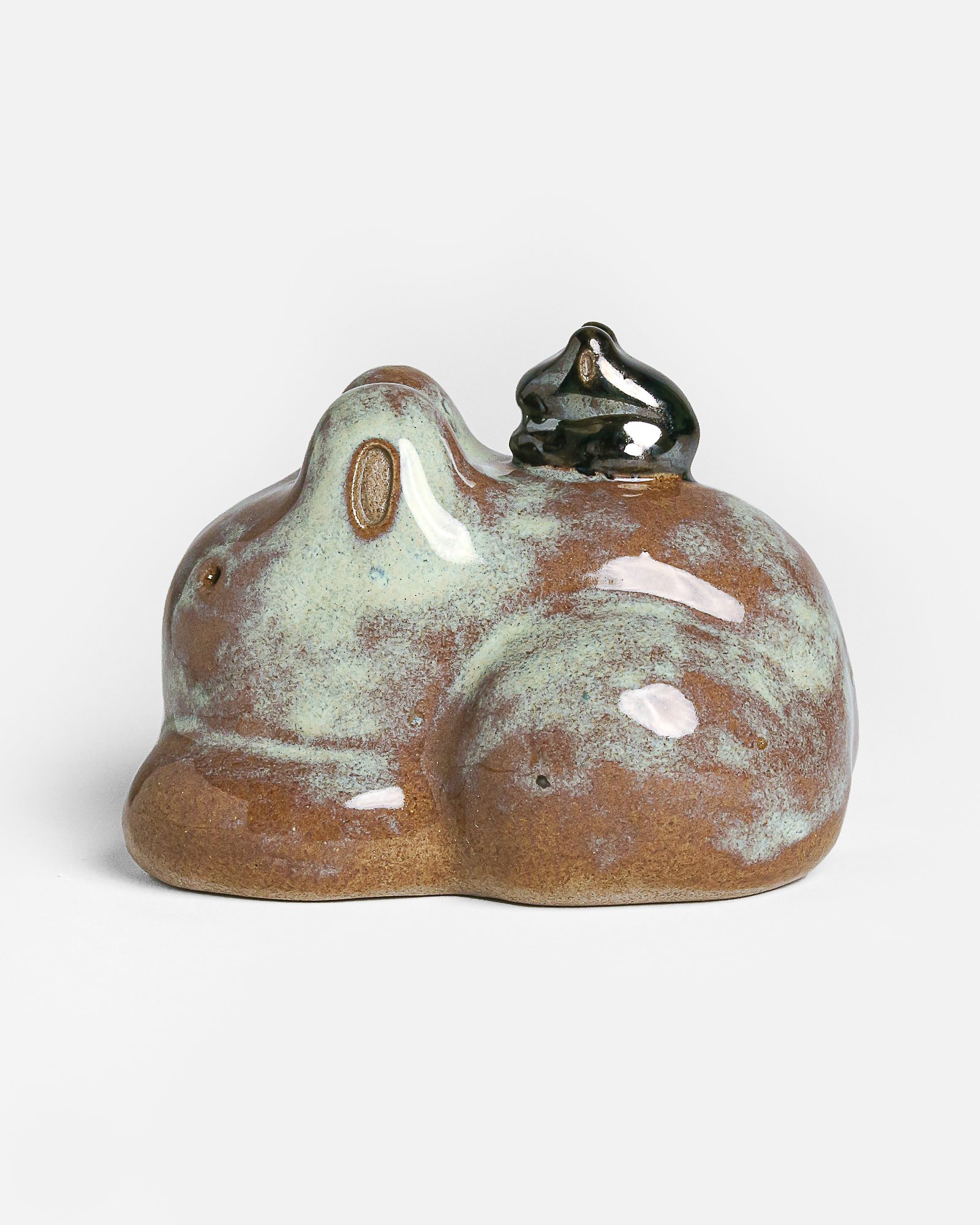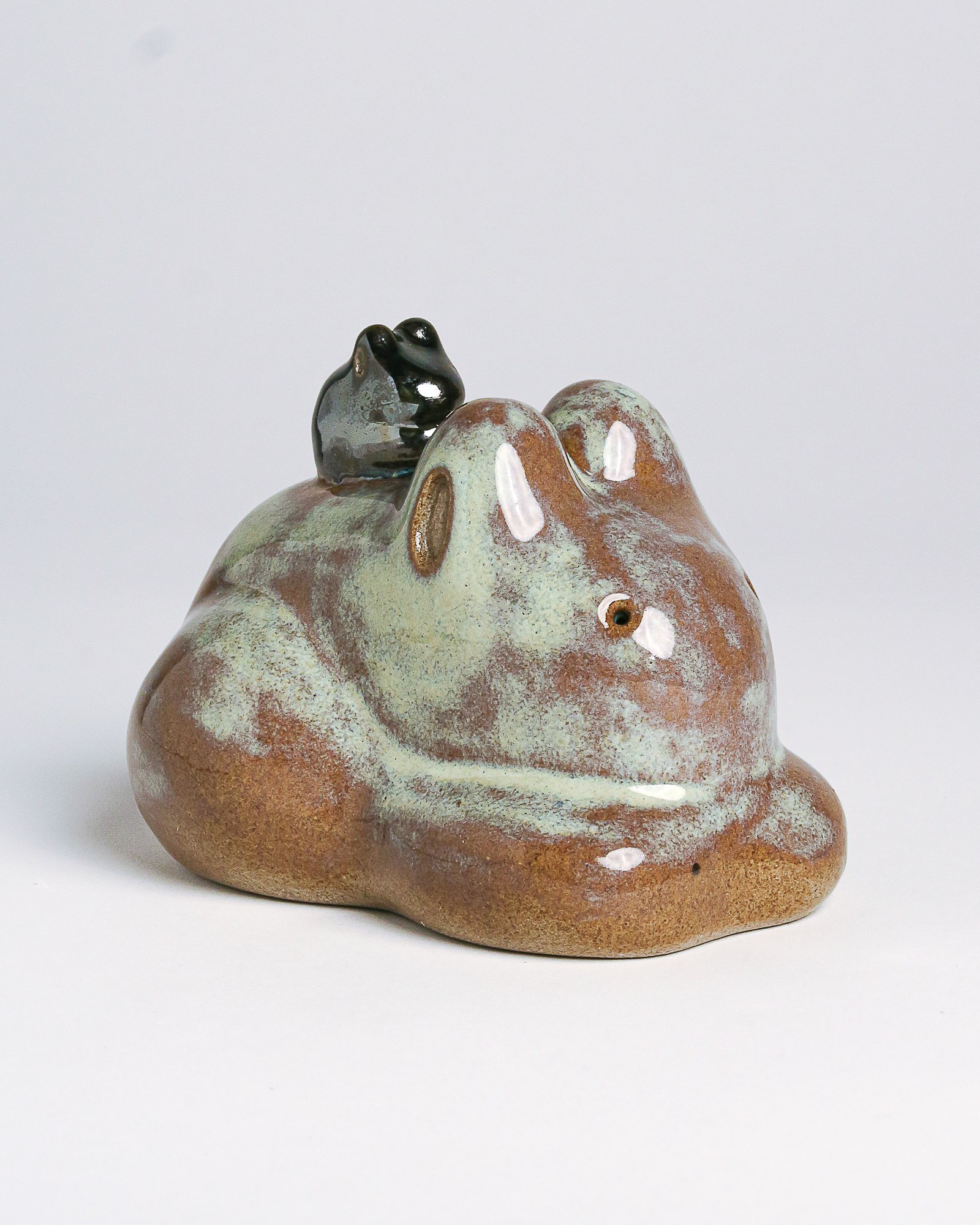 Glossy brown/turquoise variegated glaze all over frog with chrome black baby frog on top