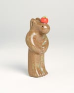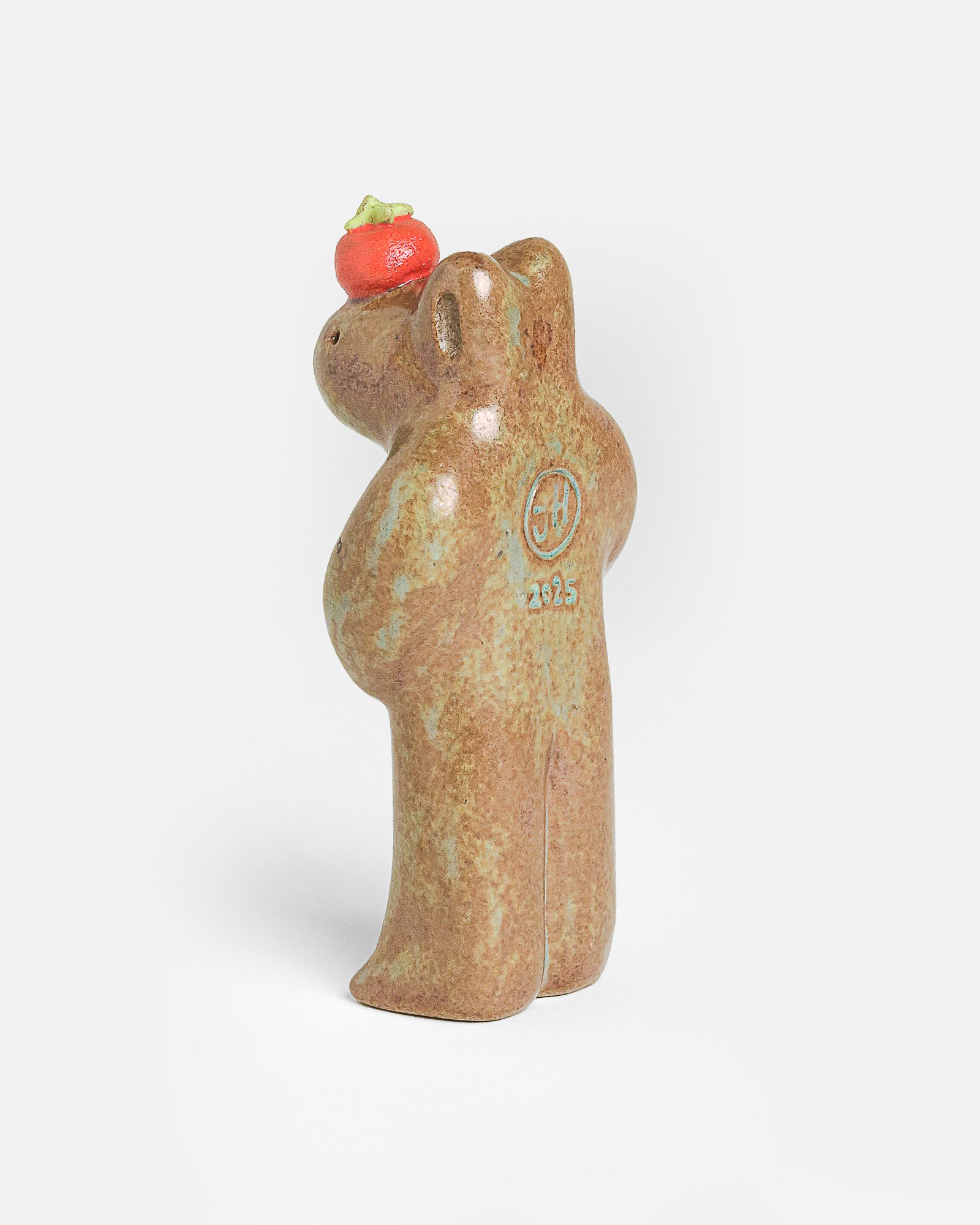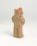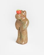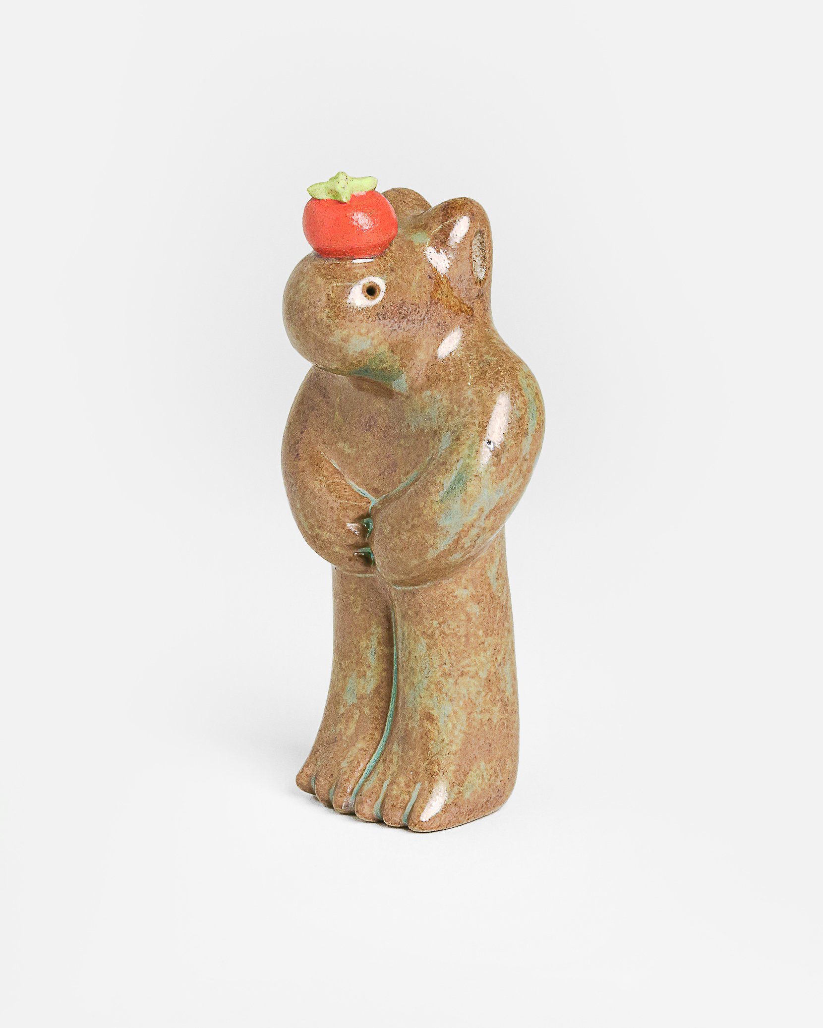 Glossy straw yellow glaze with turquoise blue variations all over frog with red tomato on top